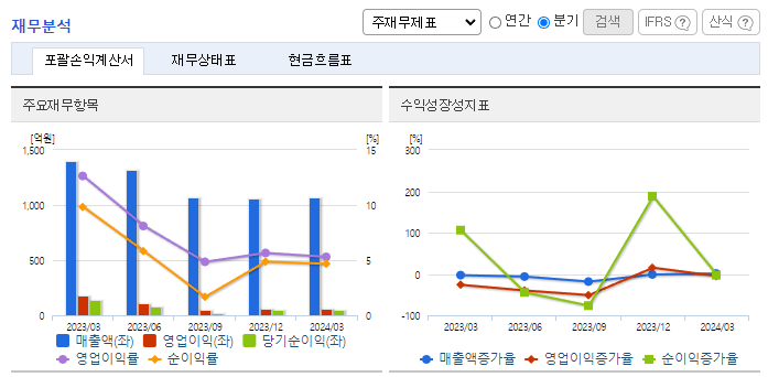 -2024년 3월 전년동기 대비 연결기준 매출액은 23.8% 감소, 영업이익은 68.1% 감소, 당기순이익은 63.8% 감소. 현재 건설중장비 부품 동사의 생산실적은 2023년 1분기말 생산금액 대비 14.94% 감소하였음. 생산실적이 감소한 원인으로는 글로벌 시장의 위축 및 중국 내수 시장 침체로 인하여 생산 실적이 감소되었음. 세계 건설 중장비 시장은 수요 감소에 따른 재고, 생산, 판매 감축이 있음.