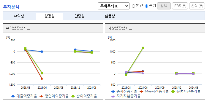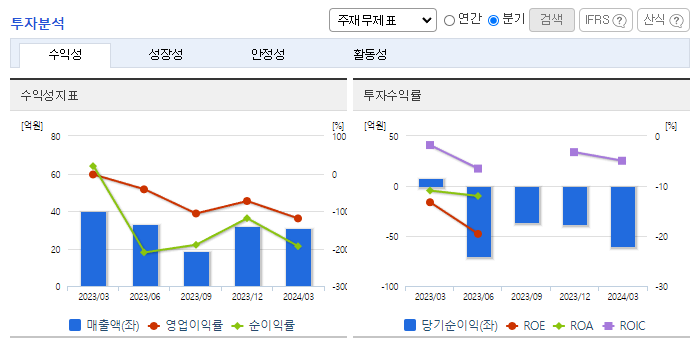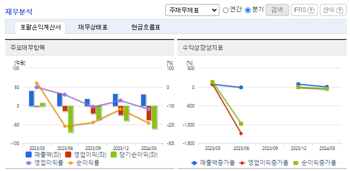 -2024년 3월 당분기 연결기준 매출액은 30억 원, 영업손실은 37억 원, 당기순손실은 60억 원을 기록함. 신규 주력사업으로 추진하는 로봇 매출이 유의미하게 발생하지 않았고, 신사업 준비 등으로 인한 판매관리비 증가로 영업손실이 발생함. 2030년 글로벌 로보틱스 시장규모는 약 300조 원으로 전망하고 있음. 동사는 현재 로봇 관련 부품생산 및 조립을 위한 제조 라인 구축을 완료하고 다양한 소프트웨어 연구개발을 진행 중임.