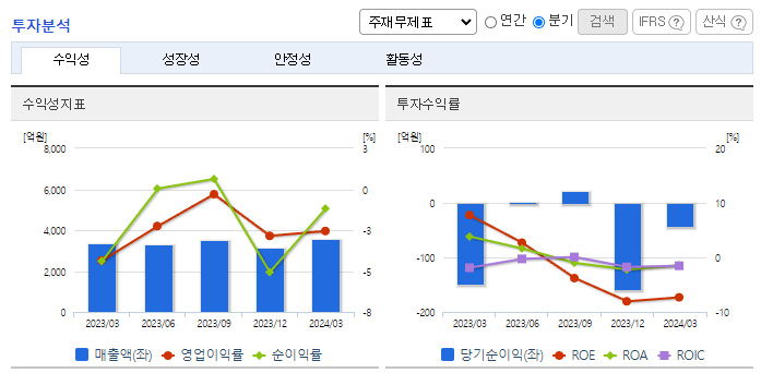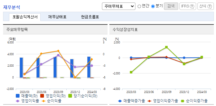 -2024년 3월 전년동기 대비 연결기준 매출액은 5.4% 증가, 영업손실은 38.1% 감소, 당기순손실은 31.7% 감소. CSP 계열인 FBGA 제품과 eMCP제품등을 공격적으로 수주하고 첨단 신규 PKG 제품인 FLIPCHIP LINE을 증설 및 가동에 따라 매출 증대에 크게 기여하고 있음. 차량용 Display, 통신모듈 등 Automotive향 HDI PCB 수요가 증가하는 추세에 발맞추어 폭넓은 고객을 확보하고 있음.