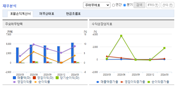 -2024년 3월 전년동기 대비 연결기준 매출액은 30.6% 증가, 영업이익은 229.1% 증가, 당기순이익은 187% 증가. 모든 법인이 두 자릿수 성장하며 분기 매출 5천억 원을 처음 넘어섰음. 성장으로 인한 레버리지 효과와 함께 인플레 완화로 인해 원가율 또한 개선되었음. 24년 국내 강세/중국 회복/미국 흑전/동남아 급증으로 연결 매출 2조 원, 영업이익 2천억 원을 상회하는 최대 실적을 기록할 전망임.