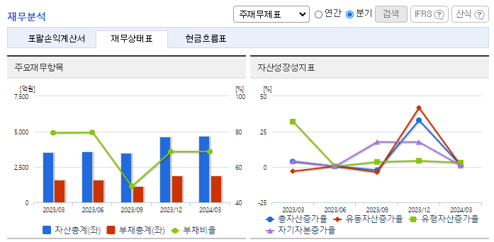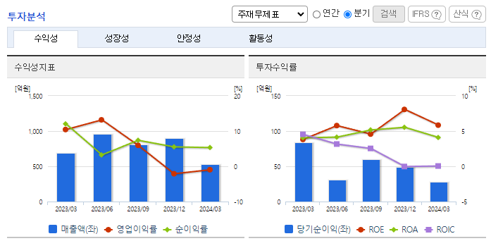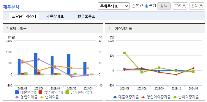 -2024년 3월 전년동기 대비 연결기준 매출액은 22.9% 감소, 영업이익 적자전환, 당기순이익은 63.5% 감소. 이차전지 자동화 설비 매출 증가와 함께 자회사 탑머티리얼의 매출 감소와 초기 투자비 반영을 이유로 영업이익 하락. 차세대 전고체 전지 라인의 활성화로 턴키로 수주가 확대되고, 자동화 로봇 제품인 AGV와 AMR 장비의 추가 수주가 기대됨. 또한, LFP 양극개발 성공으로 소재사업부문에서 매출 확대가 본격화될 전망임.