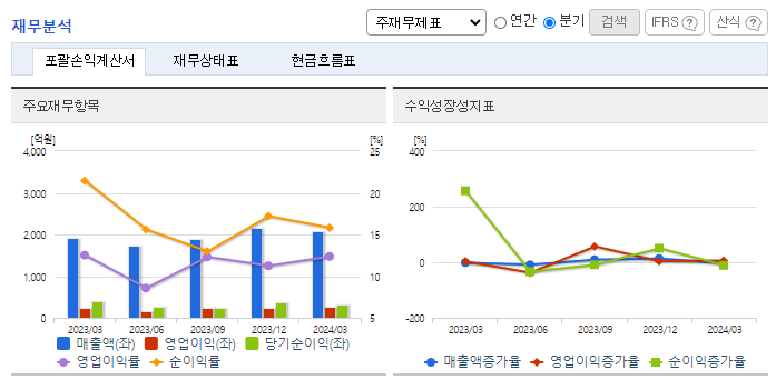 -2024년 3월 전년동기 대비 연결기준 매출액은 8.4% 증가, 영업이익은 7.1% 증가, 당기순이익은 19.9% 감소. 중국, 베트남 등 주요 수출 국가를 대상으로 브랜드샵 오픈, TV광고 집행, 고객 접점 activation 등 공격적인 브랜드 마케팅을 추진하고 있어 매출 성장이 기대됨. 온라인, 할인점, 홈쇼핑 등 다양한 유통경로와 가격 경쟁력, 차별화된 제품으로 시장을 확대하기 위해 노력하고 있음.