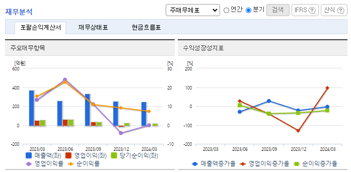 -2024년 3월 전년동기 대비 별도기준 매출액은 33.9% 감소, 영업이익 적자전환, 당기순이익은 68.6% 감소. 미국에 본사를 둔 글로벌 배터리 기업 SES홀딩스와 리튬메탈전지 제조 라인 공급 계약을 체결하였으며 계약금액은 2,500만 달러임. 동사의 엔지니어링 프로젝트 일부가 납기 지연되면서 리튬인산철(LFP) 양극재 신규 기술 개발 등 이차전지 소재 부문 초기 투자비 관련 지출의 영향으로 수익성 약화됨.