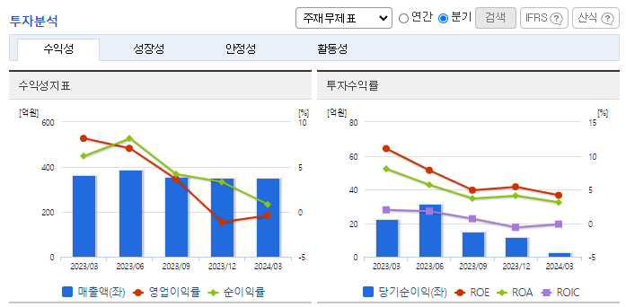 -2024년 3월 전년동기 대비 연결기준 매출액은 3.6% 감소, 영업이익 적자전환, 당기순이익은 87.2% 감소 2차 전지 산업의 부진에 따라 주요 사업부인 전자재료 사업부의 2차 전지용 테이프 매출이 감소하였으며, 경기악화에 따라 식품포장용 랩 사업부 또한 매출이 감소하였음 동사는 2차 전지 사업성장에 따라 새만금 국가산업단지에 신규 공장을 준비하였으며, 2024년 상반기 초도 매출을 시작으로 전자재료사업부 매출 증대를 기대하고 있음
