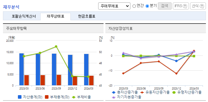 -2024년 3월 전년동기 대비 별도기준 매출액은 14% 감소, 영업손실은 34.6% 감소, 당기순이익 흑자전환. 동사는 모든 사업부의 매출이 전년동기 대비 감소하였음에도, TPA 및 MEG와 같은 원재료 가격이 하락하고 판관비 및 인건비 절감의 노력으로 영업손실 폭이 축소됨. 동사 제품의 거래 확대 및 신규거래선의 개발 및 관리, 나아가 신시장을 개척하는데 노력함.