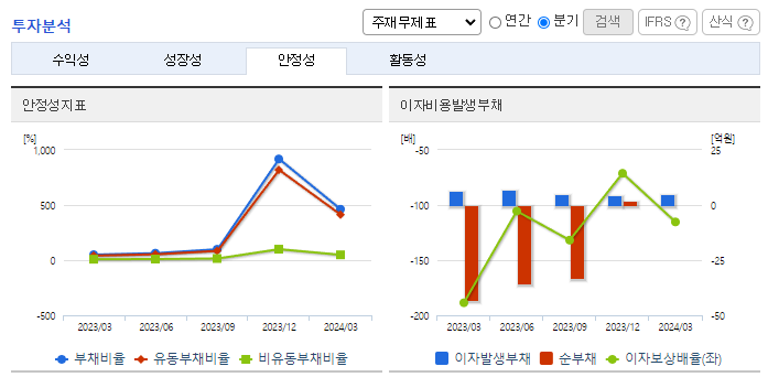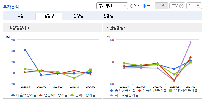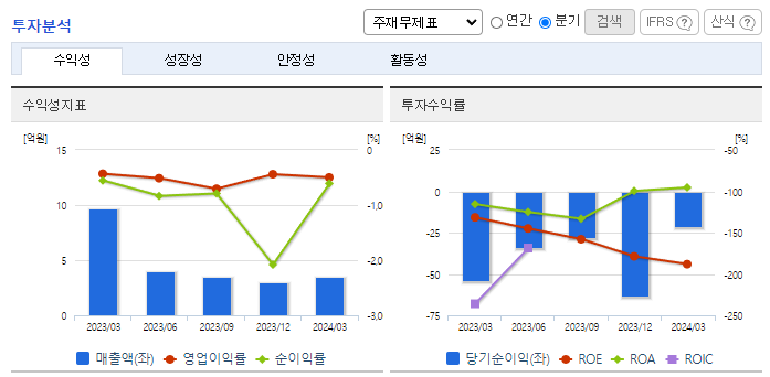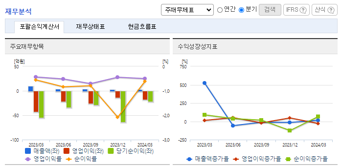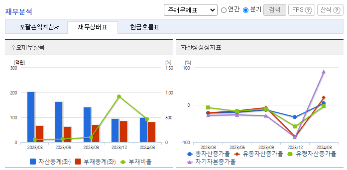 -2024년 3월 전년동기 대비 연결기준 매출액은 64.2% 감소, 영업손실은 58.7% 감소, 당기순손실은 60.7% 감소. 사업 연도 감사 결과 자기 자본의 50%를 초과하는 법인세 비용 차감 전 손실이 발생하여 상장폐지 사유가 발생하였으나, 이를 일부 해소하였음. 2024년 1월 결손금 조전을 위해 무상감사를 진행하였으며, 2024년 1월 납입된 유상증자로 최대주주가 엠컨설팅에서 와담투자조합으로 변경되었음