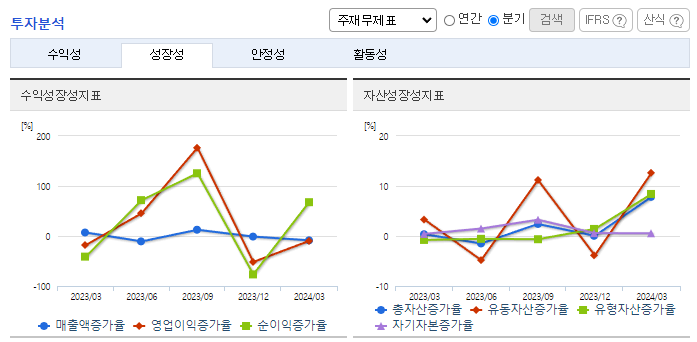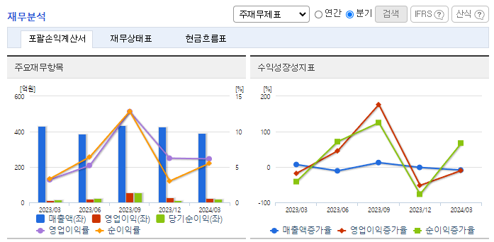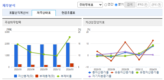 -2024년 3월 전년동기 대비 연결기준 매출액은 9.3% 감소, 영업이익은 74.3% 증가, 당기순이익은 99.1% 증가. 고순도 에탄올 기술 연구가 활발해져 국내 반도체 설비 증설과 반도체 소재 국산화라는 분위기 속 잠재적 수요 증대가 예상됨. 친환경 훈증제인 비바킬사업 부문 또한, 수입 검역용 소독처리제뿐만 아니라 곡물창고, 식품 및 국민 보건 위생 차원의 수요 등 사용처가 확대되고 있어 관련 시장은 급성장할 것으로 전망됨.