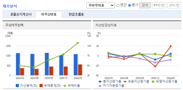 -2024년 3월 전년동기 대비 연결기준 매출액은 4.3% 증가, 영업손실은 6% 감소, 당기순손실은 50.7% 증가. 전년과 비슷한 매출 수준 유지하고 있으며, FMM양산 목표 달성과 연구개발을 위한 단기차입금 확대로 이자비용과 성장규모 증가할 예정임. 2025년까지 IT용 8세대 OLED FMM 개발을 마치고 2026년부터 FMM·OMM 양산에 착수하겠다는 계획을 밝힘.