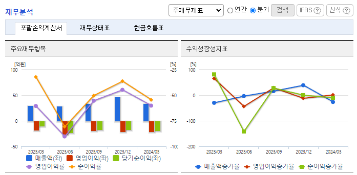 -2024년 3월 전년동기 대비 연결기준 매출액은 14% 증가, 영업손실은 13.4% 증가, 당기순손실은 93.7% 증가. 동사는 적극적인 신약 개발 투자로 비용이 지속적으로 발생 중이나 매출이 성장 중에 있어 손실폭은 점차 감소 중에 있음. 전립선암 치료제 FC705에 대해 국내 임상 2상을 진행 중이며 2023년 5월 미국 FDA 임상 1상을 완료하였고, 현재 임상 2a상을 진행하고 있음.