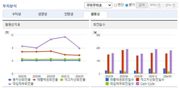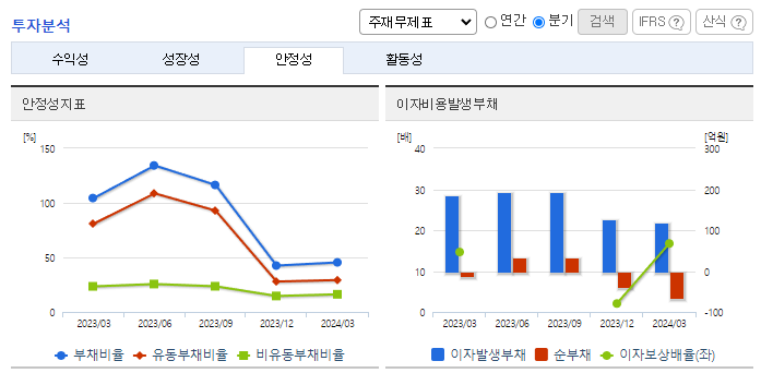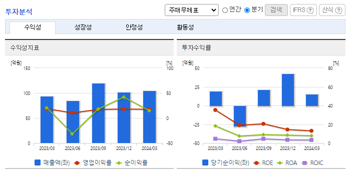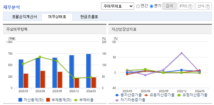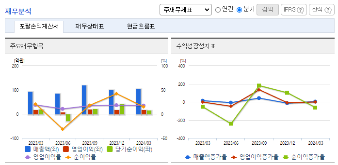 -2024년 3월 전년동기 대비 별도기준 매출액은 12.4% 증가, 영업이익은 4.8% 증가, 당기순이익은 19.3% 감소. 매출액 증가하며 외형 확대 되었으나, 법인세 비용이 새로 인식되며 전년동기 대비 당기순이익 감소함. 제품별 매출비율은 OLED 소재 97.08%, OLED 원료 2.08%, 상품 및 기타 0.84%로 구성되어 있고, 주로 직판 형식의 국내 매출이 대부분을 차지함.