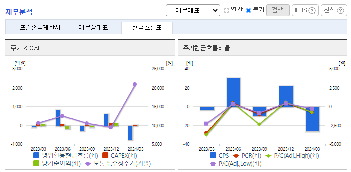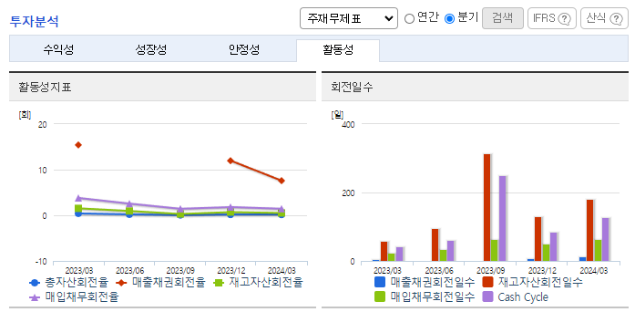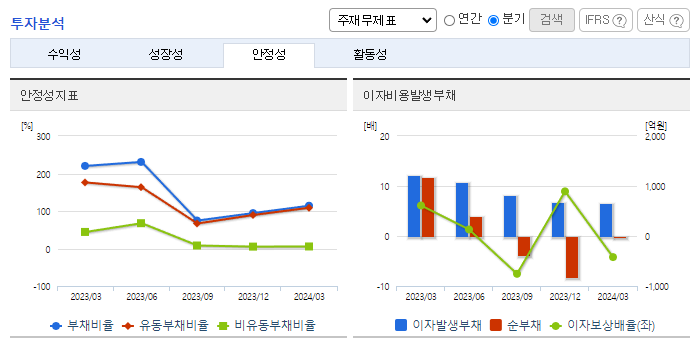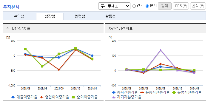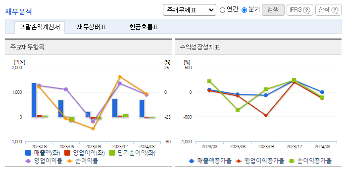 -2024년 3월 전년동기 대비 연결기준 매출액은 48.8% 감소, 영업이익 적자전환, 당기순이익 적자전환. 반도체 및 태양광 장비 등인 기타 사업 부문은 180.87% 증가했지만, 2차 전지 공정장비 사업 부문이 21.48%, OLED 레이저 장비 사업 부문이 87.83% 감소하면서 전체 매출액이 큰 폭으로 하락함. 매출은 하락했지만 판관비는 14.8% 증가하면서 영업이익에 악영향을 줌.
