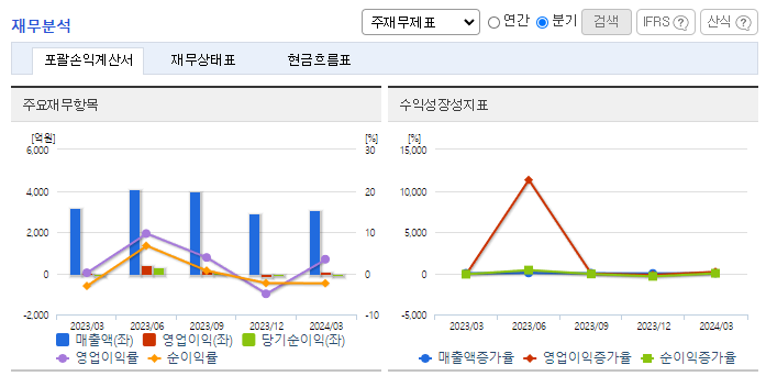 -2024년 3월 전년동기 대비 연결기준 매출액은 2.9% 감소, 영업이익은 2911% 증가, 당기순손실은 23.4% 감소. 매출은 소폭 감소했으나, 원재료인 생계, 사료원료 옥수수, 소맥, 대두박의 가격이 크게 감소해 영업이익에 긍정적인 영향을 줌. 국내 동종업계는 30여 개 업체가 영업 중으로 그 업체 간의 경쟁심화는 동사의 수익 저해요인으로 작용할 수 있음.