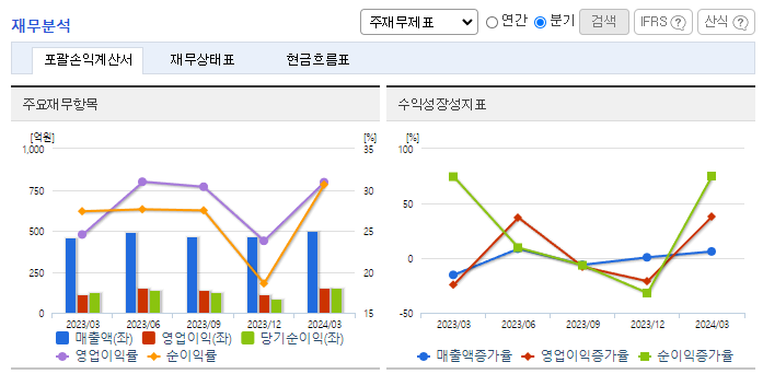 -2024년 3월 전년동기 대비 연결기준 매출액은 8.9% 증가, 영업이익은 37.2% 증가, 당기순이익은 20.4% 증가. 해외영업망 및 기타 영업망을 적극 활용하여 판매, 마케팅, 기술지원 및 고객지원 활동을 입체적으로 전개에 노력 및 동사의 제품에 대한 판매 및 A/S까지 처리할 수 있는 대리점을 46개국 120여 개 확보. 동사는 2024년 1분기 동안 수주총액 41,602 백만 원을 달성.