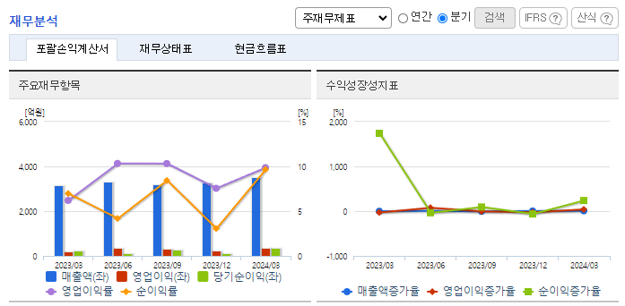 -2024년 3월 전년동기 대비 연결기준 매출액은 11.5% 증가, 영업이익은 77.4% 증가, 당기순이익은 54.6% 증가. 매출의 대부분을 구성하고 있는 자동차용 커넥터, 전자모듈, 전자용 커넥터 부문에서의 매출 상승으로 인해 수익성이 강화되었음. 2024년 자동차부문 제품평균가격이 전년동기대비 4% 증가하였으며, 전자부문의 경우 제품 평균 가격은 전년동기대비 동결되었음.