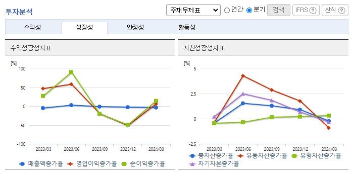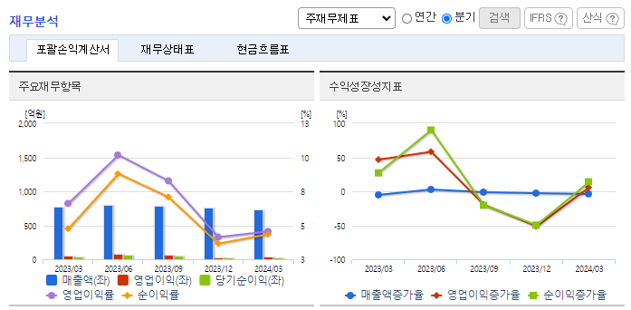 -2024년 3월 전년동기 대비 연결기준 매출액은 5.4% 감소, 영업이익은 34.8% 감소, 당기순이익은 13.6% 감소. 주요 원재료인 펄프가격 8.7% 감소, 고지 가격이 7.6% 감소하는 등 원지가격 인하로 인해 매출단가가 감소하여 골판지 상자 매출액이 소폭 감소함. 골판지상자 공정에서 필요한 주원료인 골판지 원지를 생산하므로 필요한 원지를 빠른 시간 내에 공급이 가능함.