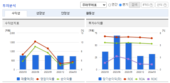 -2024년 3월 전년동기 대비 연결기준 매출액은 5.4% 감소, 영업이익은 34.8% 감소, 당기순이익은 13.6% 감소. 주요 원재료인 펄프가격 8.7% 감소, 고지 가격이 7.6% 감소하는 등 원지가격 인하로 인해 매출단가가 감소하여 골판지 상자 매출액이 소폭 감소함. 골판지상자 공정에서 필요한 주원료인 골판지 원지를 생산하므로 필요한 원지를 빠른 시간 내에 공급이 가능함.
