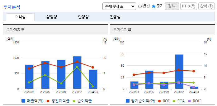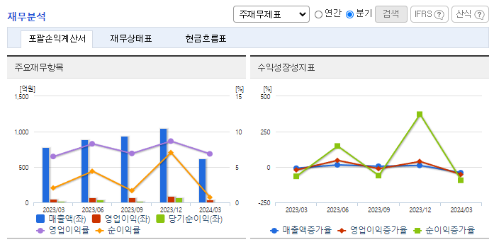 -2024년 3월 전년동기 대비 연결기준 매출액은 19.5% 감소, 영업이익은 14.9% 감소, 당기순이익은 66.1% 감소. 주력 사업부문인 ATM 부문이 현금 사용이 줄어드는 추세에 따라 시장규모가 줄어들어 매출은 감소세를 보임. 단가를 올리거나 서비스 수준을 낮추며 이익 규모를 지키는 것이 목표임. 공항, 철도 등 복잡한 기능이 추가된 키오스크 기기 공급 확대를 추진 중임.