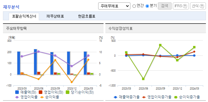 -2024년 3월 전년동기 대비 별도기준 매출액은 0.5% 감소, 영업이익은 3.9% 증가, 당기순이익은 1704.1% 증가. 식품의약품안전처로부터 우울증 치료제 ‘파마데스벤라팍신서방정 100밀리그램’의 품목 허가를 획득하였음. 국내에서 처음으로 오리지널 프리스틱서방정 동일염 제품으로 허가를 획득한 만큼 확실히 경쟁력 있는 제품이 될 것으로 기대됨. 적극적인 영업 활동으로 시장에 빠르게 진입하고 점유를 확대할 수 있을 것으로 전망.