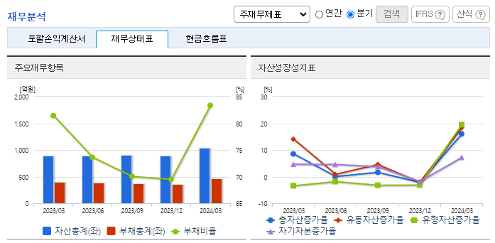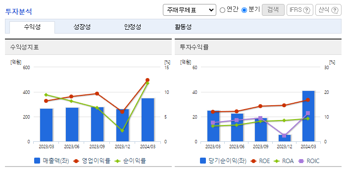 -2024년 3월 전년동기 대비 별도기준 매출액은 30.6% 증가, 영업이익은 98% 증가, 당기순이익은 63.2% 증가. 전년동기대비 매출액이 증가하였고, 원가율과 판관비율 모두 개선되면서 영업이익은 전년동기대비 2배 수준으로 증가함. 당기순이익은 전년동기대비 63% 증가. 높은 생산 기술력을 바탕으로 신시장 개척과 신제형, 신제품 개발로 성장을 지속하며 수익성을 확보할 계획임.