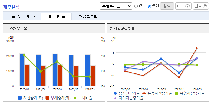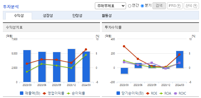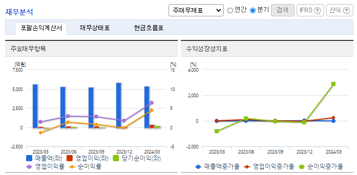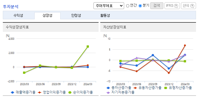 -2024년 3월 전년동기 대비 연결기준 매출액은 4.8% 감소, 영업이익은 336.5% 증가, 당기순이익 흑자전환. 판매비와 관리비가 9.8% 증가했음에도 원재료 가격 하락과 함께 매출원가가 12.5% 감소하면서 영업이익에 긍정적인 영향을 줌. 매트리스폼 개발, 전동벨트 개발, 점증제, 우레탄, 고무복합재 등 제지 외 분야 신규테마 발굴/개발로 신성장동력 확보함.
