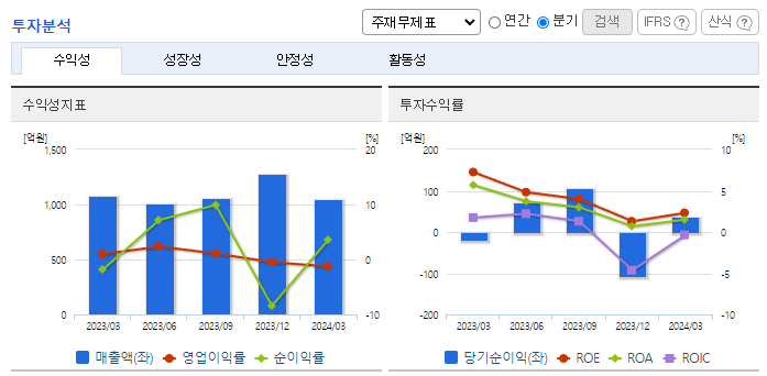 -2024년 3월 전년동기 대비 연결기준 매출액은 3.3% 감소, 영업이익 적자전환, 당기순이익 흑자전환. 상표사용수익 및 배당수익 감소와 자회사 실적 부진 영향으로 전년 동기 대비 매출과 영업이익이 부진했음. 당기순이익의 경우 핵심 계열사인 한솔제지 실적이 개선한 영향으로 전년 대비 지분법 이익이 증가해 흑자 전환함. 기존 사업의 유관 분야와 보유역량을 활용하여 내부 프로세스를 갖추고 신규 아이템 발굴을 적극 실행해 나가는 중.