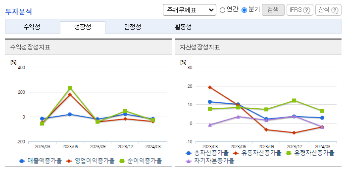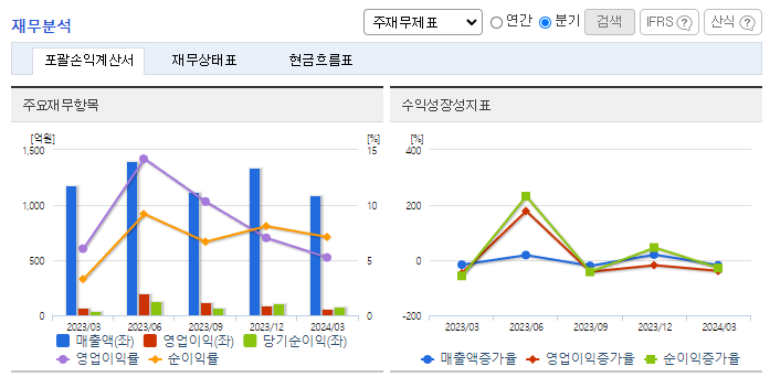 -2024년 1분기 별도기준 매출액은 전년동기 대비 7.8% 감소, 영업이익은 20% 감소, 당기순이익은 99.7% 증가. 건설 경기가 악화됨에 따라 동사의 2024년 1분기 매출액이 감소하였으며 금리인상 및 건설경기의 침체가 이어짐에 따라 시장 규모가 감소할 것으로 예측되고 있음. 기존 포틀랜드시멘트뿐만 아니라 슬래그시멘트 등 다양한 제품 간 시너지 확대를 도모하고 있음.