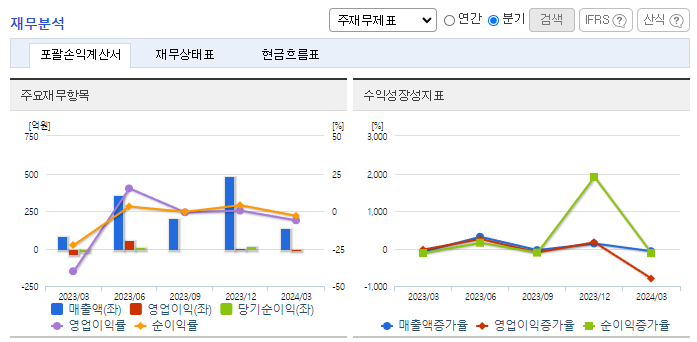 -2024년 3월 전년동기 대비 연결기준 매출액은 58.2% 증가, 영업손실은 75.5% 감소, 당기순손실은 79.6% 감소. 향후 고성능 개인 안전장비의 수요는 지속될 것으로 예상. 주요 제품군의 가격 상승 역시 지속될 것으로 예상. 동사가 추진하는 국방 부문 신규사업은 과학화 교전훈련체계(Live Training System), 워리어플랫폼(Warrior Platform), 장갑차 후방카메라 장착, 지상레이저 표적지시기 사업임.