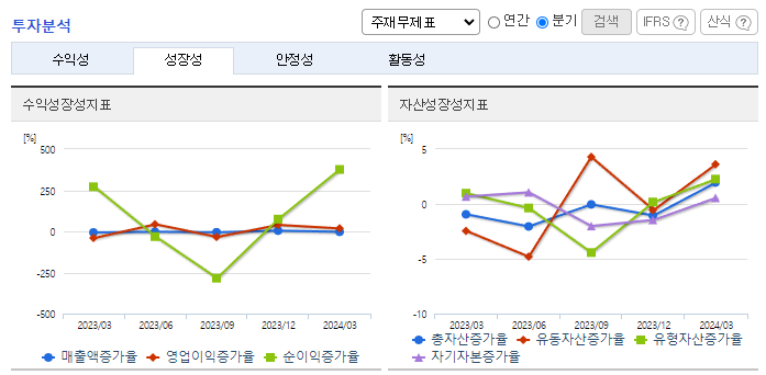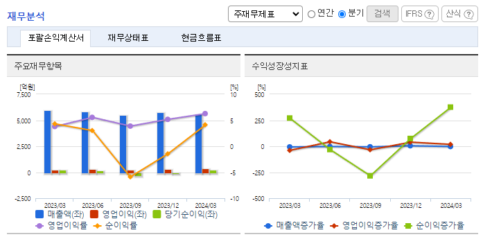-2024년 3월 전년동기 대비 연결기준 매출액은 6.4% 감소, 영업이익은 54.9% 증가, 당기순이익은 7.6% 증가. 주력 부문인 제지 및 반도체 부문의 매출이 감소하여 전체 외형에 영향을 주었으나, 비용 절감의 노력이 더해져 영업이익은 성장세를 유지 중임. 동사는 올해 경영 안정화와 종속회사별 성장동력 확보를 통해 실적 성장세를 나타내기 위해 집중할 예정임.