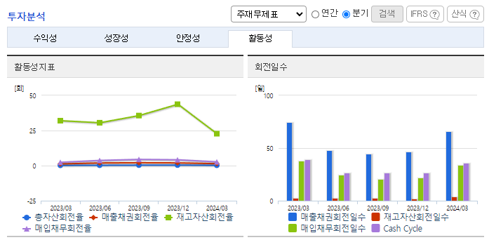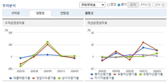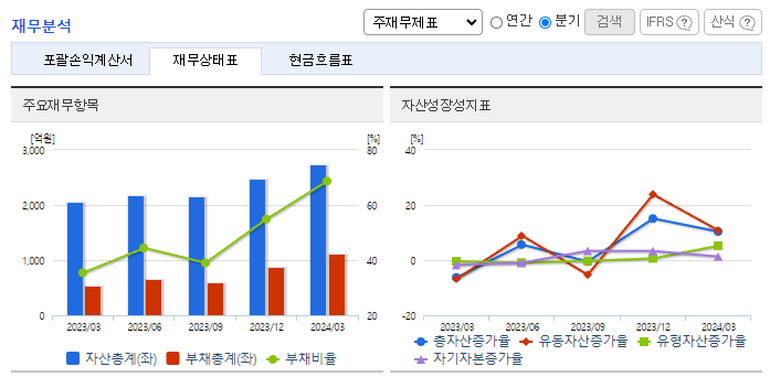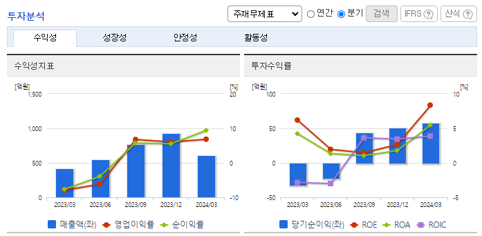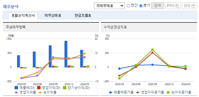 -2024년 3월 전년동기 대비 연결기준 매출액은 44.6% 증가, 영업이익 흑자전환, 당기순이익 흑자전환. 2차 전지 공정 자동화 컨설팅 전문 인력들을 확보하며 한국타이어 미국 공장에 1,000억 원 규모 스마트물류 시스템을 수주하는 등 해외 진출에도 노력하고 있음. 이차전지, 식음료·제약 등 다양한 산업에서 스마트 물류 수주를 이어가고 있으며 2024년 1분기 기준 수주잔고는 3800억 수준임.