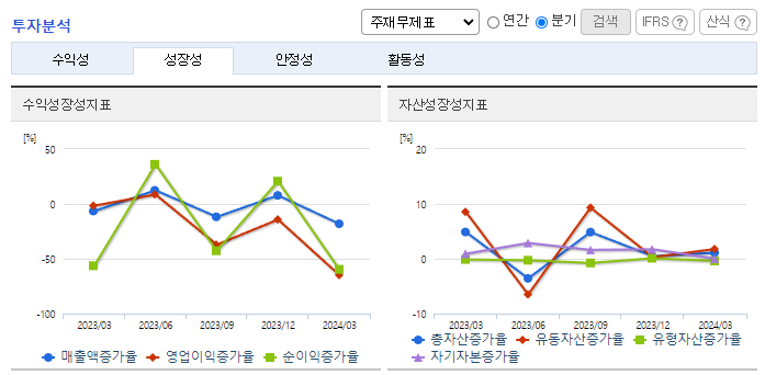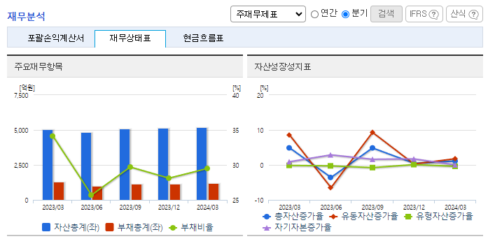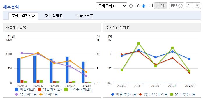 -2024년 3월 전년동기 대비 연결기준 매출액은 12.4% 감소, 영업이익은 79.4% 감소, 당기순이익은 64.3% 감소. 건설부문은 장기적으로 정부 SOC 예산의 감소와, 지방자치단체 및 공기업 투자여건이 악화 등 건설업 전반에 걸쳐 경영 환경이 악화되었음. 최근 고품질 건축소재인 '티티맥스' 브랜드를 출시하여 표면처리 소재 시장에 본격적으로 진출하는 등 고부가가치 제품의 사업기반 확장을 위해 노력하고 있음.