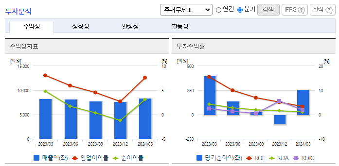 -2024년 3월 전년동기 대비 연결기준 매출액은 0.3% 증가, 영업이익은 5.4% 감소, 당기순이익은 38.9% 감소. 글로벌 탄소섬유 시장의 수요 증가에 맞춰 2023년 11월 전북 전주에 연 9000톤 규모 생산 능력을 갖춘 탄소섬유 공장을 증설해 규모의 경제에 따른 수익성 확대가 기대됨. 2024년은 중국 경쟁사 증설분 공급 증가로 수급 악화가 예상되나 동사는 차별화 제품 확대와 지속적인 경쟁력 확보를 노력할 예정.