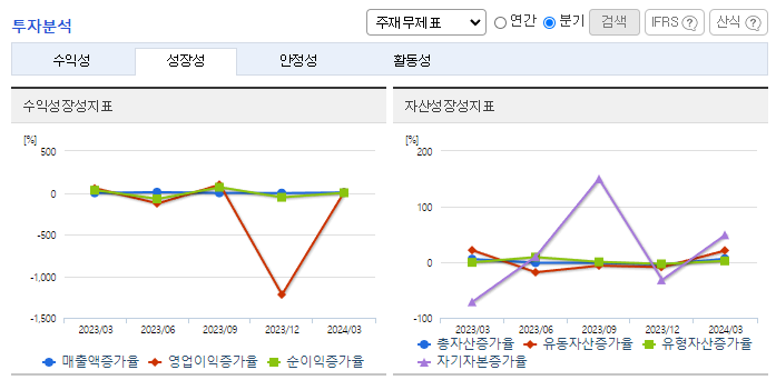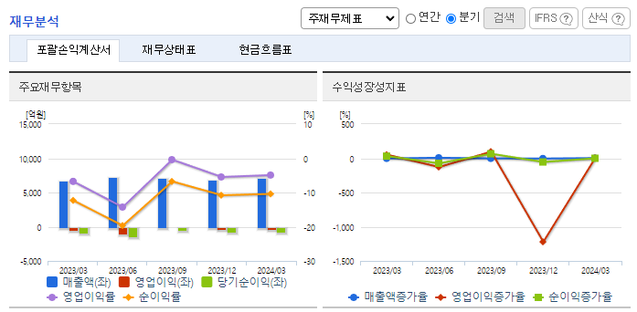 -2024년 3월 전년동기 대비 연결기준 매출액은 6.1% 증가, 영업손실은 23.1% 감소, 당기순손실은 10.2% 감소. 지속적인 품질 차별화를 통하여 고부가가치 제품을 개발하고, 고객의 Needs를 반영한 신규 Item을 생산하여 고객의 Value를 높이고 있음. 적극적인 시장조사를 통해 신규 거래선을 확보하고 지역을 다변화하여 글로벌 판매를 확대하고 있음.