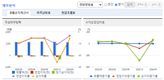 -2024년 3월 전년동기 대비 연결기준 매출액은 1.8% 감소, 영업손실은 67.4% 감소, 당기순손실은 42.7% 감소. 주요 원재료 일부의 가격이 안정화되며 원가율이 하락함. 매출은 전년동기 대비 소폭 감소했으나 영업손실폭은 완화됨. 후발 진입국과의 경쟁에서 우위를 차지하기 위해 고성능 섬유신소재인 Super 섬유 개발을 수행 중이며 우선 사업화 대상 제품으로 사업화 가능성을 고려해 사업화를 진행 중에 있음.