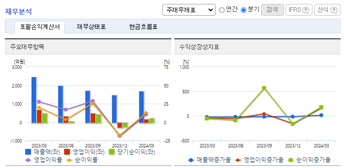 -2024년 1분기 연결기준 매출액은 전년동기 대비 31.4% 감소, 영업이익은 73.2% 감소, 당기순이익은 55.9% 감소. 전사업부문에서 매출이 감소함에 따라 영업이익 또한 감소함. 군산 제2국가산업단지에 대구경 강관공장 시설투자를 통해 기존 중소구경 강관과의 시너지효과가 발생할 수 있을 것으로 예상. 대구경 강관 생산을 통해 성장가능성이 높은 그린에너지 산업의 신규시장을 개척하고자 함.