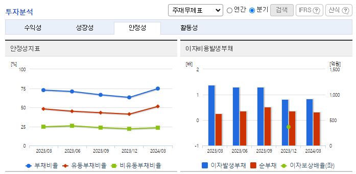 -2024년 3월 전년동기 대비 연결기준 매출액은 15.5% 감소, 영업손실은 15.8% 감소, 당기순이익 흑자전환. 동사는 최근 3년 중 가장 저조한 매출 실적을 기록함. 전년동기 대비 영업손실이 감소되었지만 최근 상승하던 모습을 멈춤. 이에 따라 PER는 33배에서 5.5배로 감소하였으며 업종 대비 저PER 종목임. LCD 산업의 경기 침체 지속으로 스마트폰과 가전의 수요가 줄어들고 있고 원재료값 상승으로 수익성이 악화 지속됨.