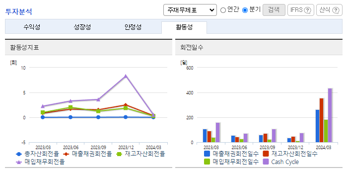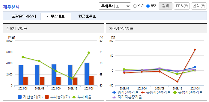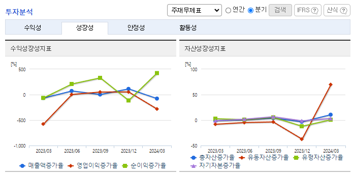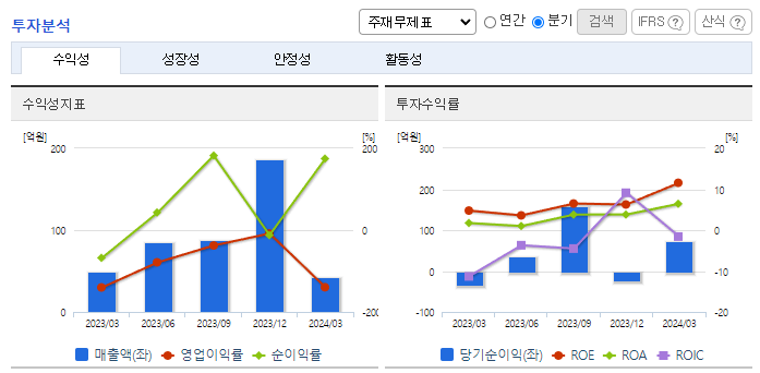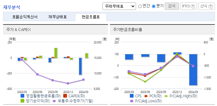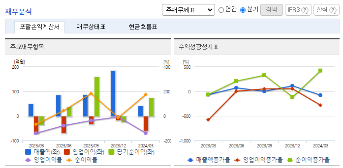 -2024년 3월 전년동기 대비 연결기준 매출액은 15.5% 감소, 영업손실은 15.8% 감소, 당기순이익 흑자전환. 동사는 최근 3년 중 가장 저조한 매출 실적을 기록함. 전년동기 대비 영업손실이 감소되었지만 최근 상승하던 모습을 멈춤. 이에 따라 PER는 33배에서 5.5배로 감소하였으며 업종 대비 저PER 종목임. LCD 산업의 경기 침체 지속으로 스마트폰과 가전의 수요가 줄어들고 있고 원재료값 상승으로 수익성이 악화 지속됨.