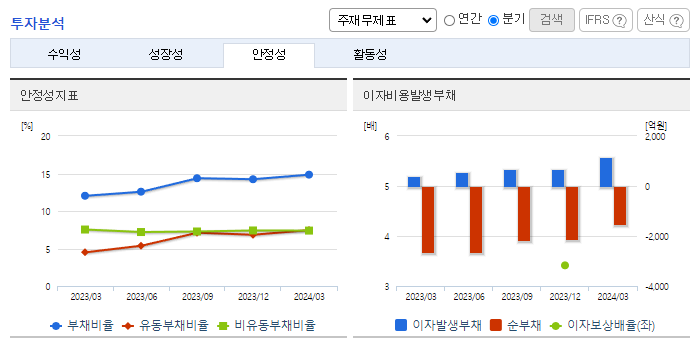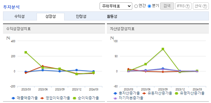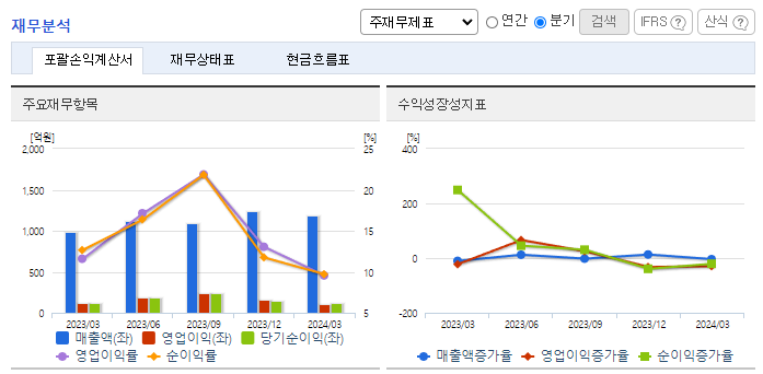 -2024년 3월 전년동기 대비 연결기준 매출액은 19.5% 증가, 영업이익은 1.5% 감소, 당기순이익은 20.8% 감소. 본부임차형 매장 확대에 따른 비용 증가가 겹치며 편의점 영업이익은 16% 감소. 편의점 매출 증가에 따른 밸류체인 선순환으로 종속회사 영업적자는 18억 원 개선됨. 실적개선의 주요인은 동사의 종속회사로 편입된 (주)케이엔더블유 및 그 종속회사 관련 연결 편입효과가 2023년 4분기부터 반영된 점에 기인함.