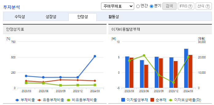 -2024년 3월 전년동기 대비 연결기준 매출액은 22.3% 증가, 영업이익은 67% 증가, 당기순이익은 87.4% 감소. 1분기 영업이익은 지난해 4분기 영업손실 617억 원에서 흑자 전환을 하였음. 1분기 세전이익은 213억 원으로 영업이익과 격차를 보였음. 지난해 4분기 LPG 국제 가격과 유가 간 차이 확대에 따른 대규모 파생상품 이익 중 상당 부분이 올해 1분기에는 파생상품 손실로 반영되었음.