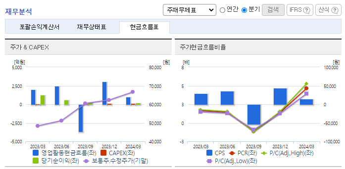 -2024년 3월 전년동기 대비 연결기준 매출액은 22.3% 증가, 영업이익은 67% 증가, 당기순이익은 87.4% 감소. 1분기 영업이익은 지난해 4분기 영업손실 617억 원에서 흑자 전환을 하였음. 1분기 세전이익은 213억 원으로 영업이익과 격차를 보였음. 지난해 4분기 LPG 국제 가격과 유가 간 차이 확대에 따른 대규모 파생상품 이익 중 상당 부분이 올해 1분기에는 파생상품 손실로 반영되었음.