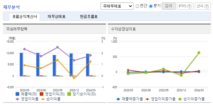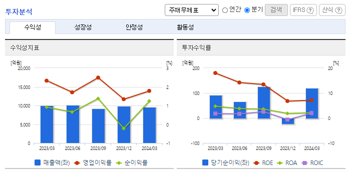 -2024년 1분기 연결기준 매출액은 전년동기 대비 4.1% 감소, 영업이익은 26.6% 감소, 당기순이익은 25.1% 증가함. 해상풍력 하부 구조물과 화공기기 등을 제작하는 제조 부문을 제외한 모든 부문의 매출이 감소함. 주력인 무역/유통 부문은 철강, 석탄 등 원자재 가격 하락으로 부진한 실적이 이어짐. 고정비용 부담 증가로 영업이익은 감소하였으나, 지분법손실의 감소와 외환 관련 손익의 개선으로 당기순이익은 증가함.