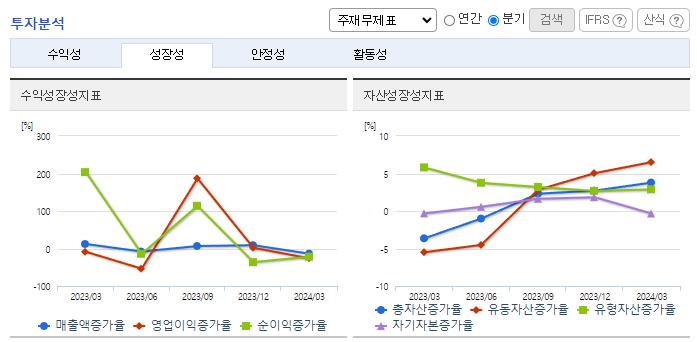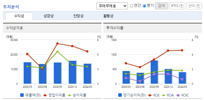 -2024년 3월 전년동기 대비 연결기준 매출액은 8% 감소, 영업이익은 0.2% 증가, 당기순이익은 7.2% 증가. 동사의 전체 매출액 중 약 78%를 차지하는 건설사업부문의 주택 사업이 부진한 탓에 전체적인 동사의 매출액 또한 감소하였지만, 원가 및 판관비 절감의 노력으로 영업손실을 방어. 프로젝트의 수주영업 시 현금흐름과 수익성을 우선적으로 고려하는 전략을 지속적으로 추진하는데 노력.