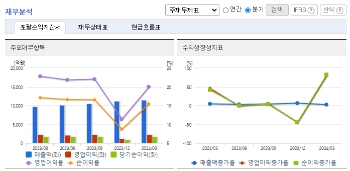 JB금융지주는 상업은행 기업으로 장중 기준으로 주가는 13,980원입니다. JB금융지주의 시가 총액은 2조 7273억 원이며 발행 주식수는 195,083,198주입니다. 외국인 보유 비중은 37.11%이며 장중 거래량은 273,223를 기록했습니다. 24년 1분기 매출액은 11,402억 원, 영업이익은 2,280억 원을 달성했으며, EPS는 884원입니다. JB금융지주 주식 배당수익률은 6.12%입니다.