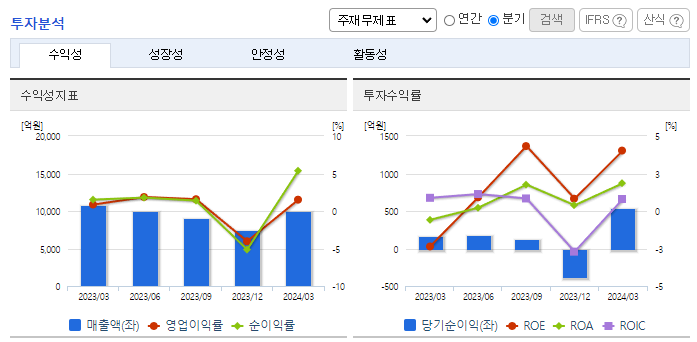 -2024년 3월 전년동기 대비 연결기준 매출액은 7.7% 감소, 영업이익은 61.1% 증가, 당기순이익은 226.1% 증가. 내수가 비교적 큰 폭으로 감소한 여파로 전체 외형 축소된 상황. 반면, 적극적인 판관비 절감 노력을 통해 수익성은 비교적 큰 폭으로 개선된 모습. 내수 업황 둔화를 감안할 때 해외시장 개척을 통한 완성차 수출 물량 확대가 성장의 관건이 될 전망.