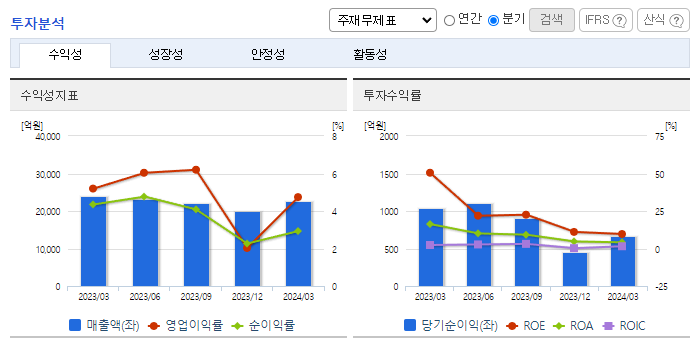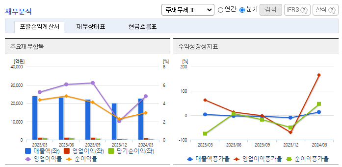 -2024년 3월 전년동기 대비 연결기준 매출액은 5.1% 감소, 영업이익은 13.4% 감소, 당기순이익은 42.5% 감소. 자동차 및 요식업 부문의 부진이 눈에 띄는 상황이며, 비용 감소에도 불구하고 매출 감소 및 원가율 상승 여파로 수익성 또한 하락한 모습. 철강부문의 회복과 매출에서 비교적 큰 부분을 차지하고 있는 전자결제 부문에서의 성장, 새롭게 추가된 자동차 성공여부가 향후 실적 개선의 포인트로 판단됨.