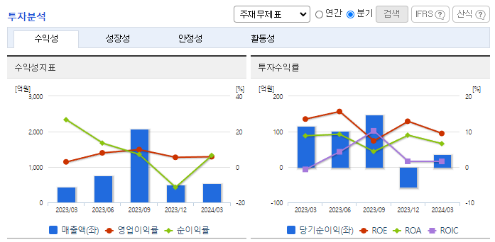 -2024년 3월 전년동기 대비 연결기준 매출액은 26.7% 증가, 영업이익은 154.9% 증가, 당기순이익은 68.8% 감소. 티타늄 케이스의 매출이 본격적으로 확대되기 시작함. 매출 확대에 대비 비용 상승은 제한적인 영업 레버리지가 발생하며 이익률은 급상승. 갤럭시 S24 시리즈 울트라 판매 호조로 동사 티타늄 캐스팅 매출이 증가하면서 전년 대비 매출이 성장하게 됨.