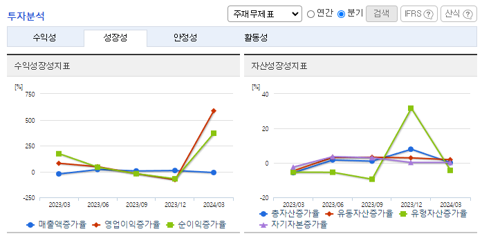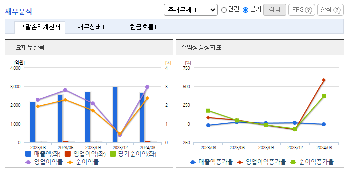 -2024년 3월 전년동기 대비 연결기준 매출액은 23.5% 증가, 영업이익은 60.8% 증가, 당기순이익은 54.4% 증가. 브랜드 중심의 유통사업의 지속적인 매출 성장과 AI기반의 컨택사업인 B2B사업의 매출 증대로 지속적으로 성장해나가고 있어 이에 따라 매출 및 영업이익이 크게 증가하였음. AICC로의 구조적 전환을 위한 투자비용 및 인력구조 개선 등으로 영업비용의 일시 증가 여파가 사라짐.