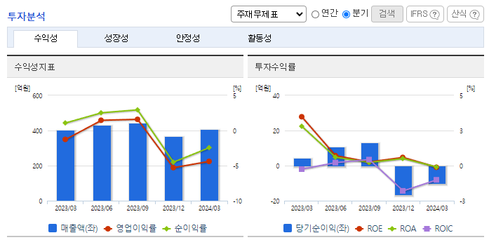 -2024년 3월 전년동기 대비 별도기준 매출액은 0.7% 증가, 영업손실은 251.3% 증가, 당기순이익 적자전환. 디스플레이 핵심 반도체인 Driver IC의 후공정인 골드범프, 웨이퍼테스트, 조립, 최종테스트 구조에서 장기 성장성을 확보하기 위해 노력 중. System IC TEST 생산라인을 구축하였고, 시장 수요 침체에 따라 COF 및 골드범프의 생산 감축 및 가동률 방어를 진행한 상황이며 고부가 디스플레이를 활용 중.