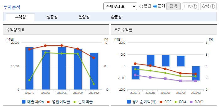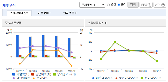 -2023년 12월 전년동기 대비 연결기준 매출액은 5.3% 감소, 영업이익은 31.5% 감소, 당기순이익은 39.7% 감소. 음료사업이 견조한 성장세를 이어간 가운데 주력인 화장품과 생활용품 사업이 전년대비 부진하며 전체 외형이 축소됨. 원가율 악화와 인건비 등 비용 증가에 따라 영업이익이 크게 감소함. 2023년 색조 브랜드 역량 강화를 위해 프리미엄 색조 브랜드 힌스(Hince)를 보유한 ㈜비바웨이브 지분 인수 지배력 획득함.