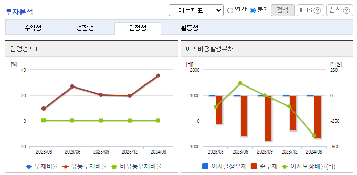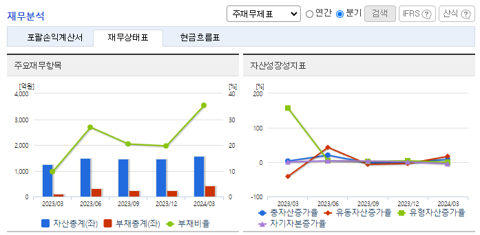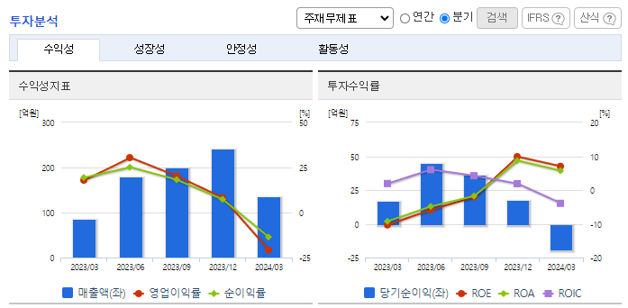 -2024년 3월 전년동기 대비 별도기준 매출액은 59.4% 증가, 영업이익 적자전환, 당기순이익 적자전환. 매출액이 상승하였으나, 영업이익이 적자로 전환된 이유는 해상풍력 사업으로 최초 수행하는 전남해상풍력 프로젝트 준비에 따른 원가 증가 때문임. 2분기부터 전남해상풍력 프로젝트가 진행됨에 따라 영업이익이 증가할 예정이며, 해외에서의 매출도 지속적으로 발생하고 있음.