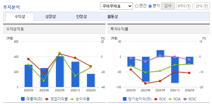 -2024년 3월 전년동기 대비 연결기준 매출액은 40.8% 감소, 영업손실은 136.3% 증가, 당기순손실은 107.8% 증가. 2023년 여름 500만 관객을 돌파한 영화'밀수', 디즈니플러스에서 개봉한 ‘무빙’ 흥행을 바탕으로 자체 IP를 기반으로 한 컨텐츠 역량을 확장할 예정. 음악사업을 영위하는 (주)뮤직앤뉴는 네이버 웹툰과 IP협력 파트너로서 원천 IP를 활용해 콘텐츠를 다각화하여 웹툰 OST 사업을 추진하고 있음.
